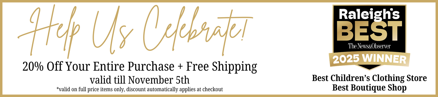 We are so excited to announce that Cottage Baby Boutique was voted Raleigh's Best Children's Clothing Store for 2024! Over 249,000 votes were cast in this year's competition. We are extremely grateful for all of our wonderful customers and their votes supporting our local small business.
