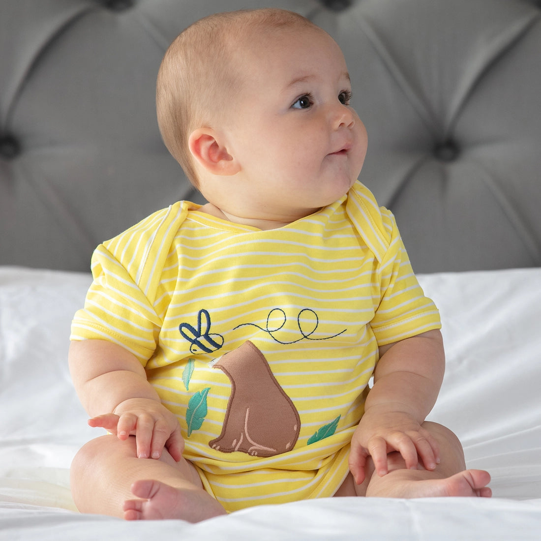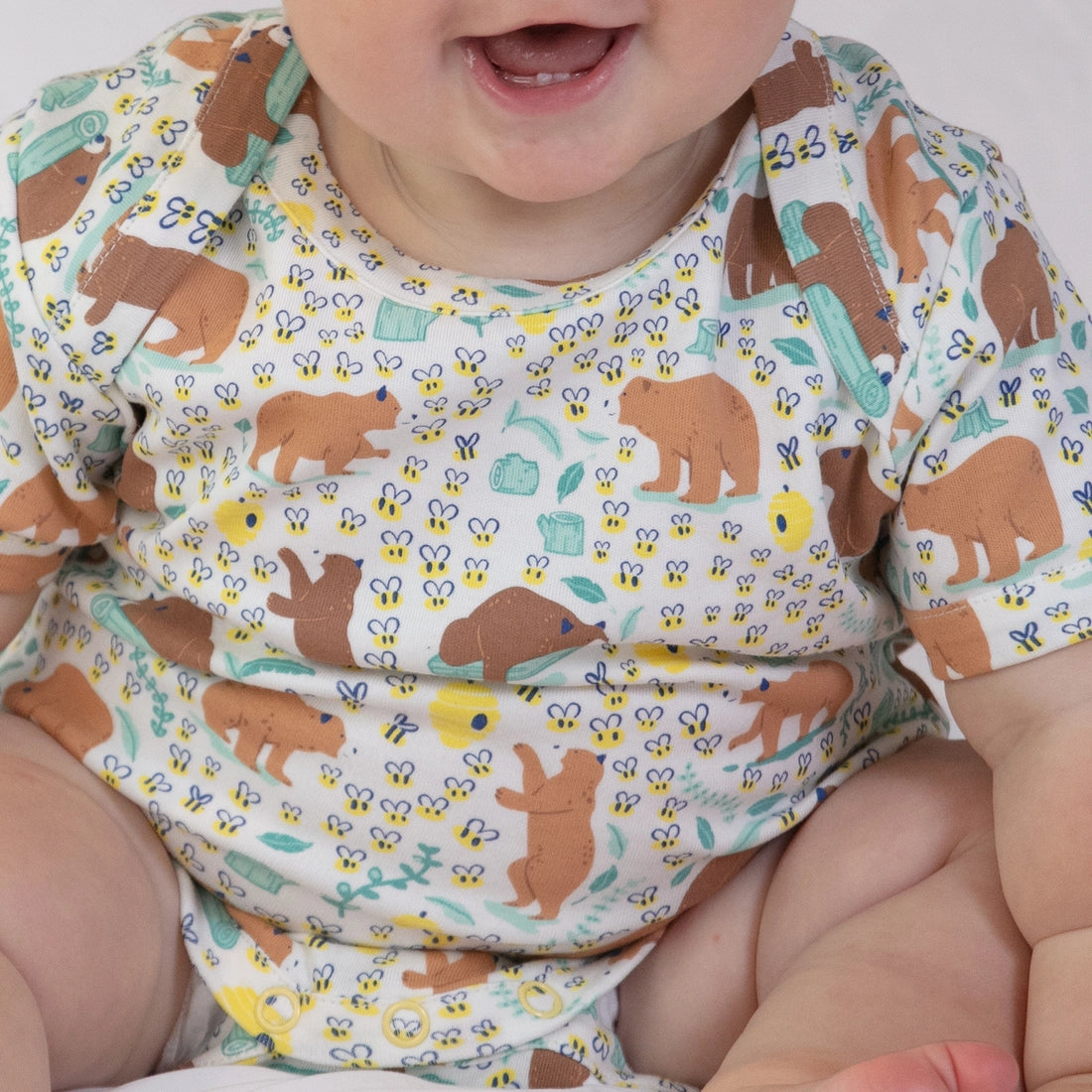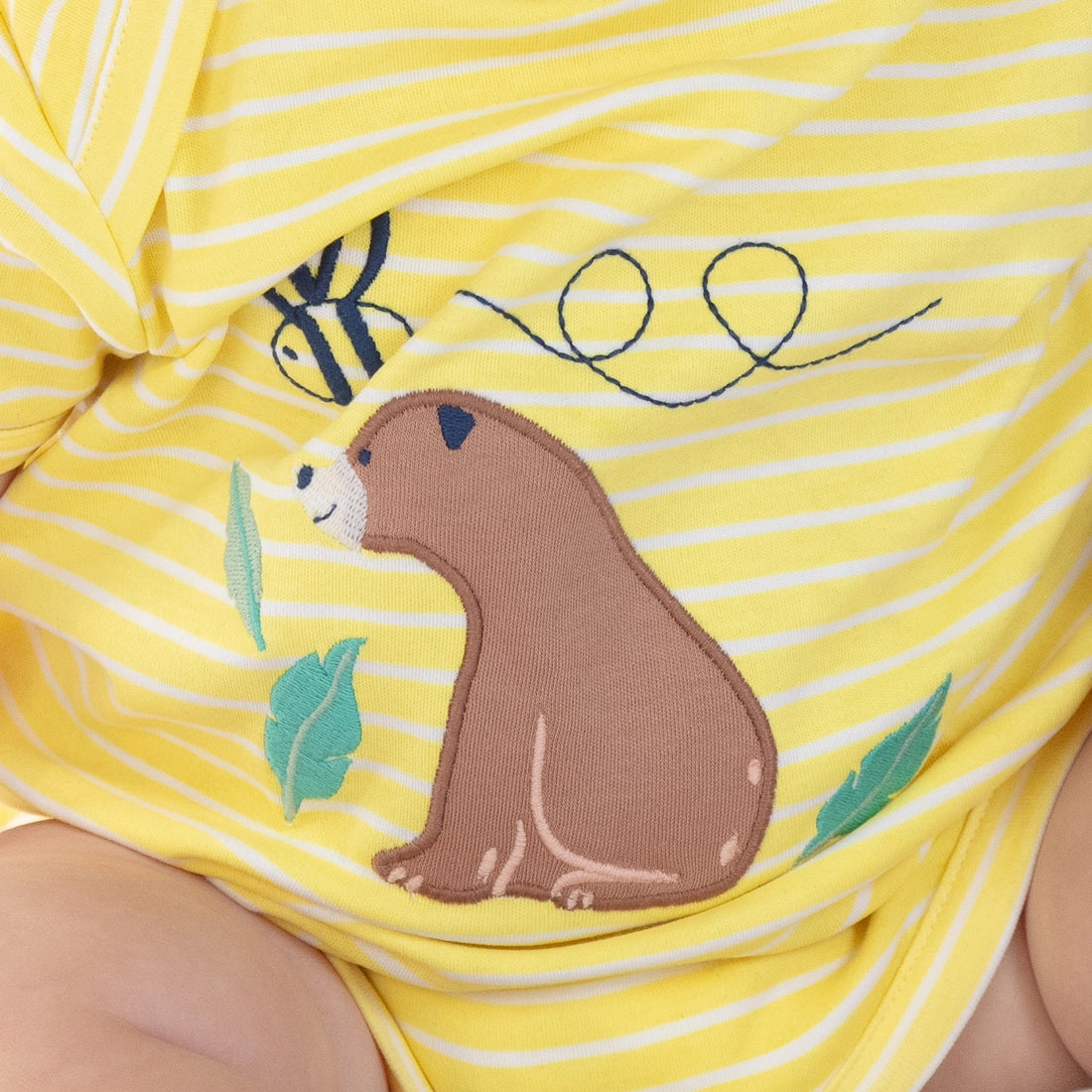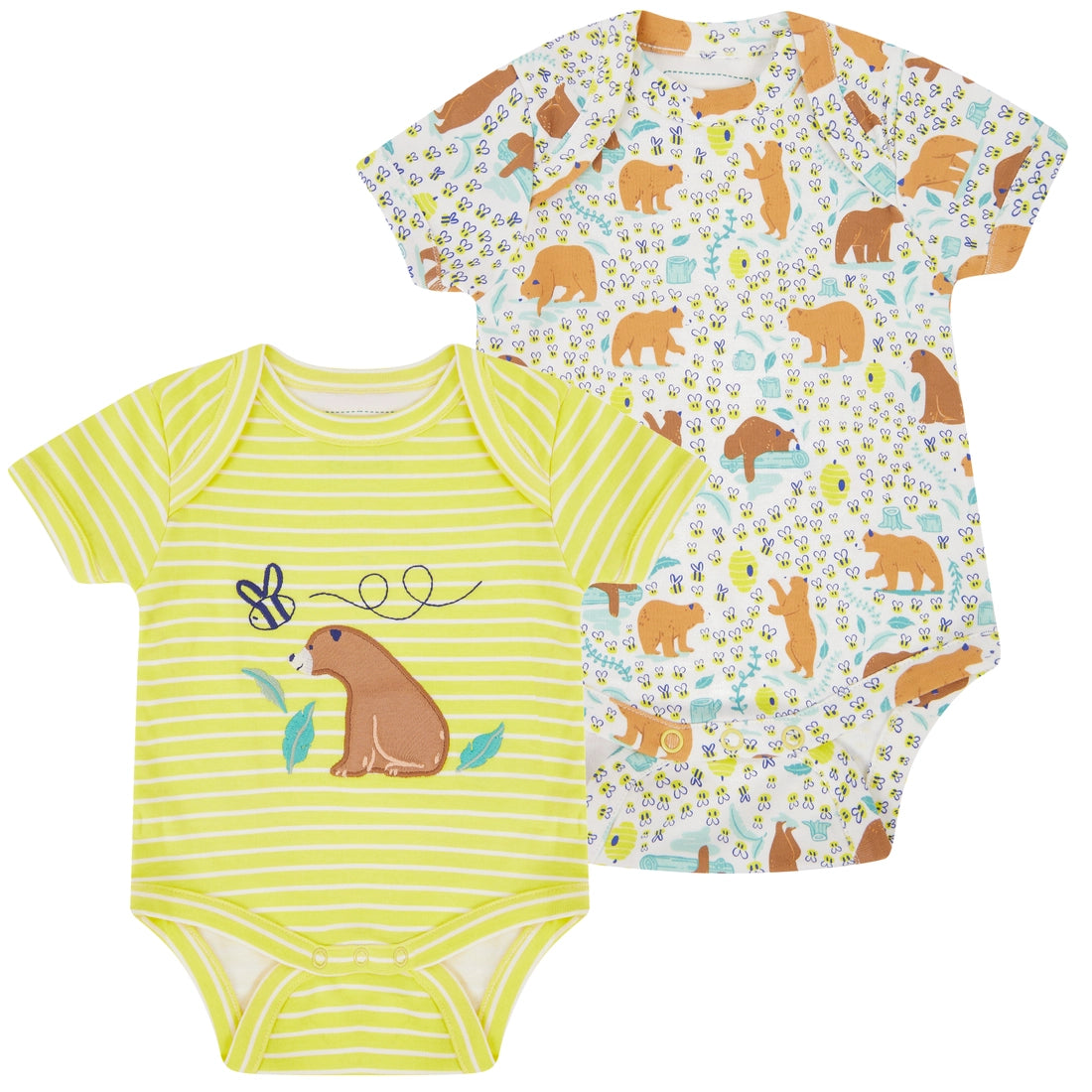 A pack of two short-sleeved baby bodysuits with envelope neck opening. One is white and bares an adorable all over baby bear print. Super cute bears, bumblebee's and beehives! The other features white and soft yellow stripes. It has a sweet baby bear appliqué on the front. Made from the softest, chemical free, organic cotton. These adorable bodysuits are a newborn baby clothing essential.