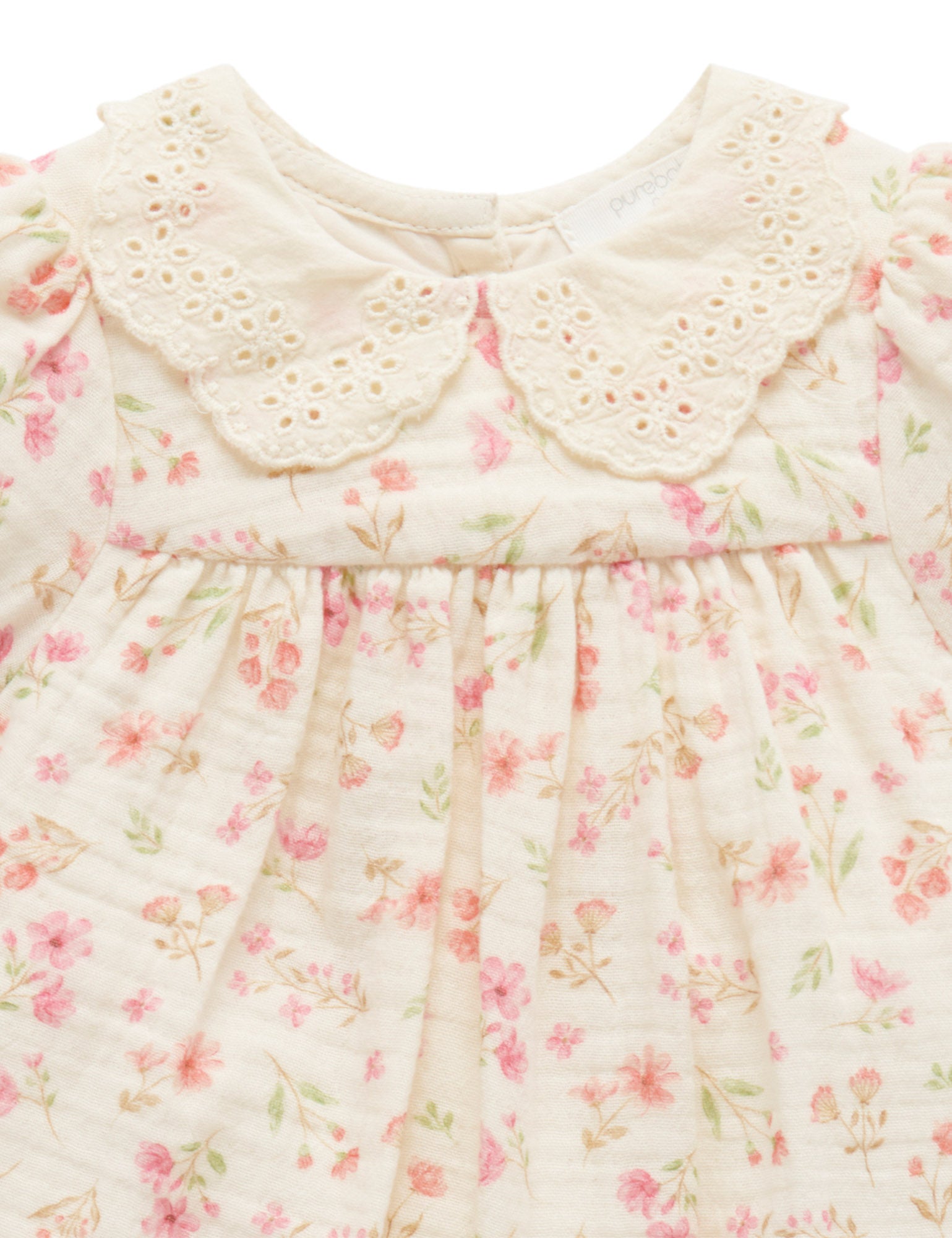 Our Seaside Floral Romper is the perfect lightweight summer style. Featuring a sweet all over watercolor floral print, lace collar and puffed cap sleeves. Designed as a balloon style, with snap clips for easy dressing and gathers around the legs for a comfortable fit. Made from the softest 100% Organic Cotton muslin for a breathable outfit.