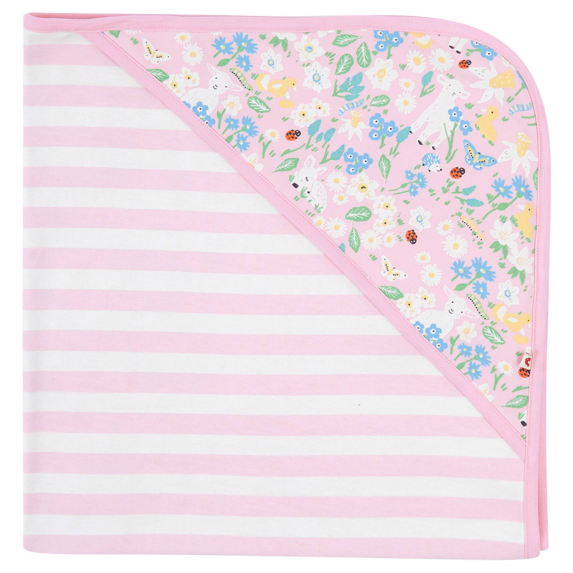 This blanket for baby comes with an integrated hood to keep little heads warm. It’s made from chemical free, super soft, organic cotton. Inside bares gorgeous baby pink and white stripes. The other side, features the cutest floral, little lamb themed print. Use this comforting jersey blanket as a receiving blanket for a newborn. The most adorable new baby gift. One Size.