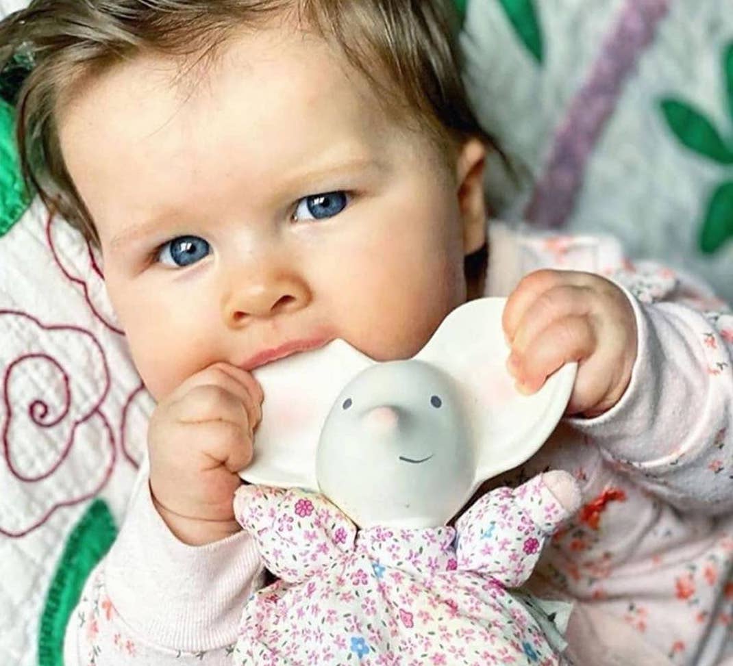 With its squeezy rubber head and soft body, this Meiya toy is easy for small hands to grip. It’s ideal for teething toddlers and its fabric body is a comforting comforter.