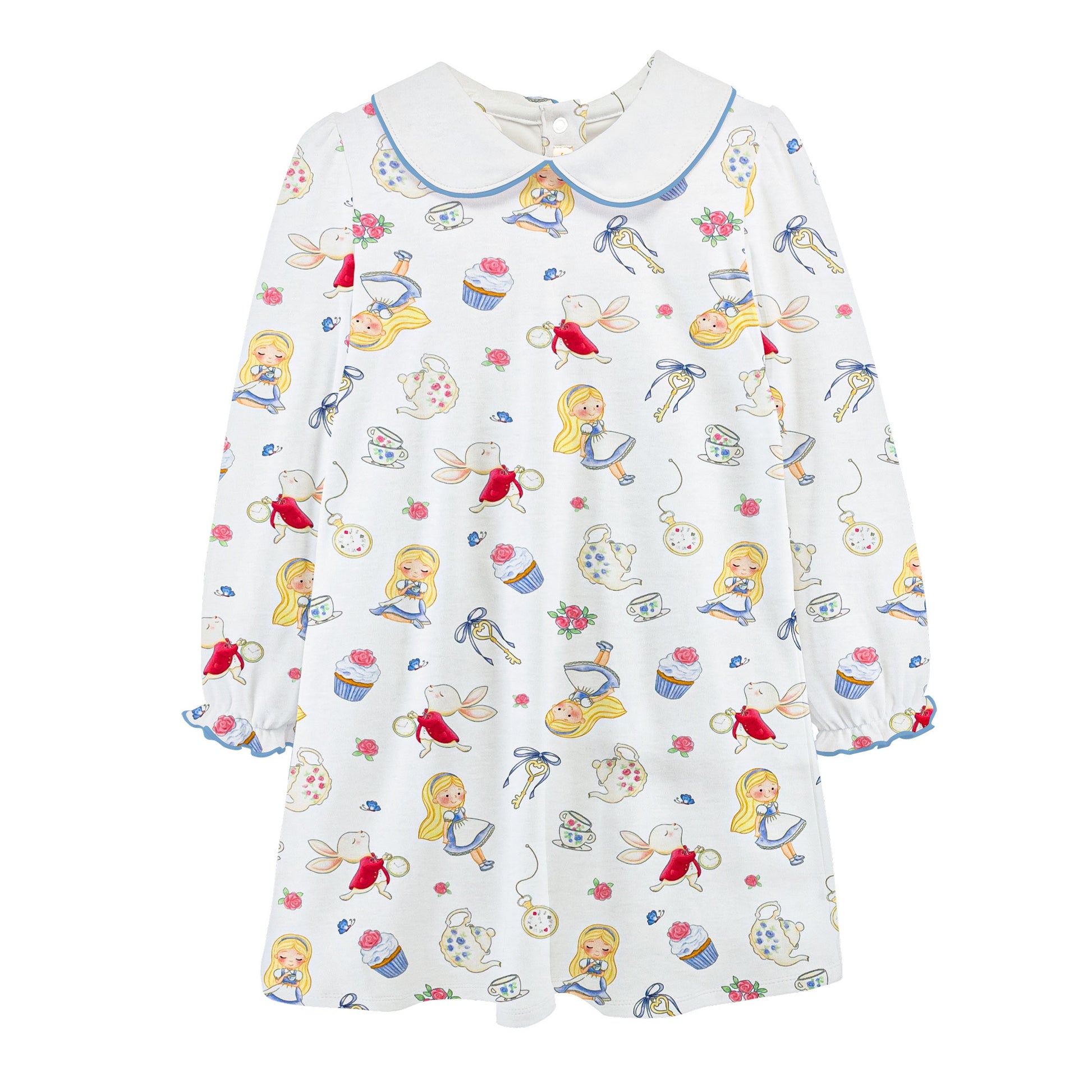 This Tea Party Pima Dress features a charming tea party pattern, rounded collar, and long sleeves, all made from 100% pima cotton. Perfect for your little one, this dress is not only stylish but also comfortable and durable. Available in toddler sizes for continued wearability.