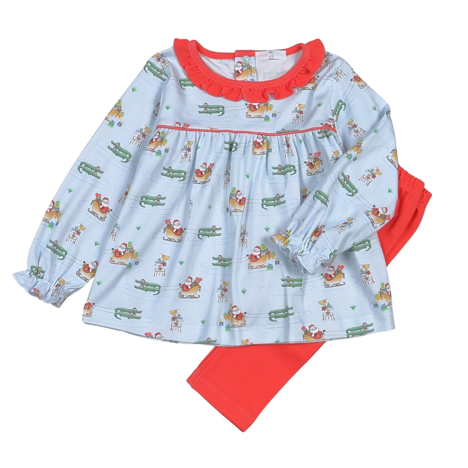 Dress your toddler girl in festive charm with the Christmas in the South Pima Top/Pant Set. Featuring a long-sleeve tunic top adorned with a ruffle red collar and an easy snap closure at the back, this outfit ensures quick changes without fuss. Crafted from 100% soft, breathable pima cotton, it offers gentle comfort all day. Paired with solid red pants, this set perfectly blends holiday spirit with cozy style for your little one’s special moments.