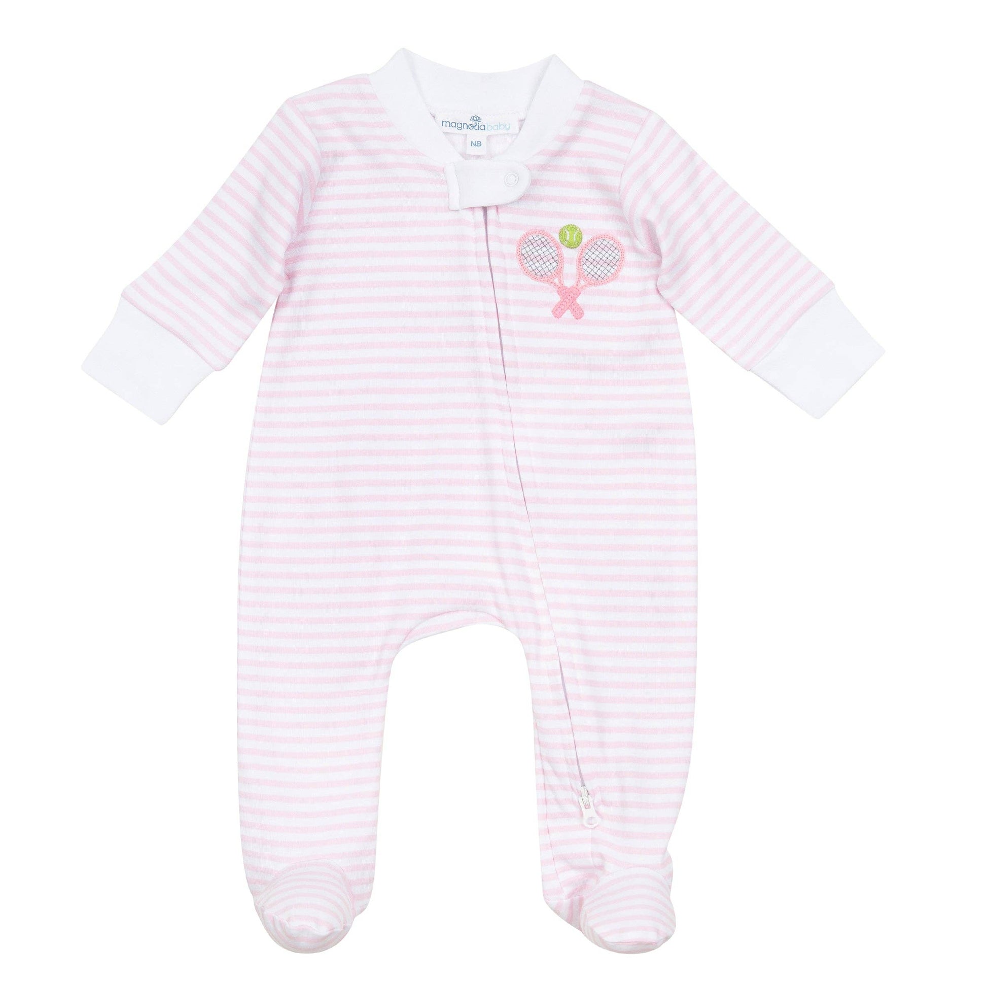 Love the game? Dress your little champion in our Courtside Cuties Applique Zip Footie in sweet pink stripes! This adorable footie is crafted from the softest Pima Cotton, ensuring your baby stays cozy and comfortable all day and night. The convenient two-way zipper allows for easy diaper changes, while the built-in footies keep tiny toes warm and snug.