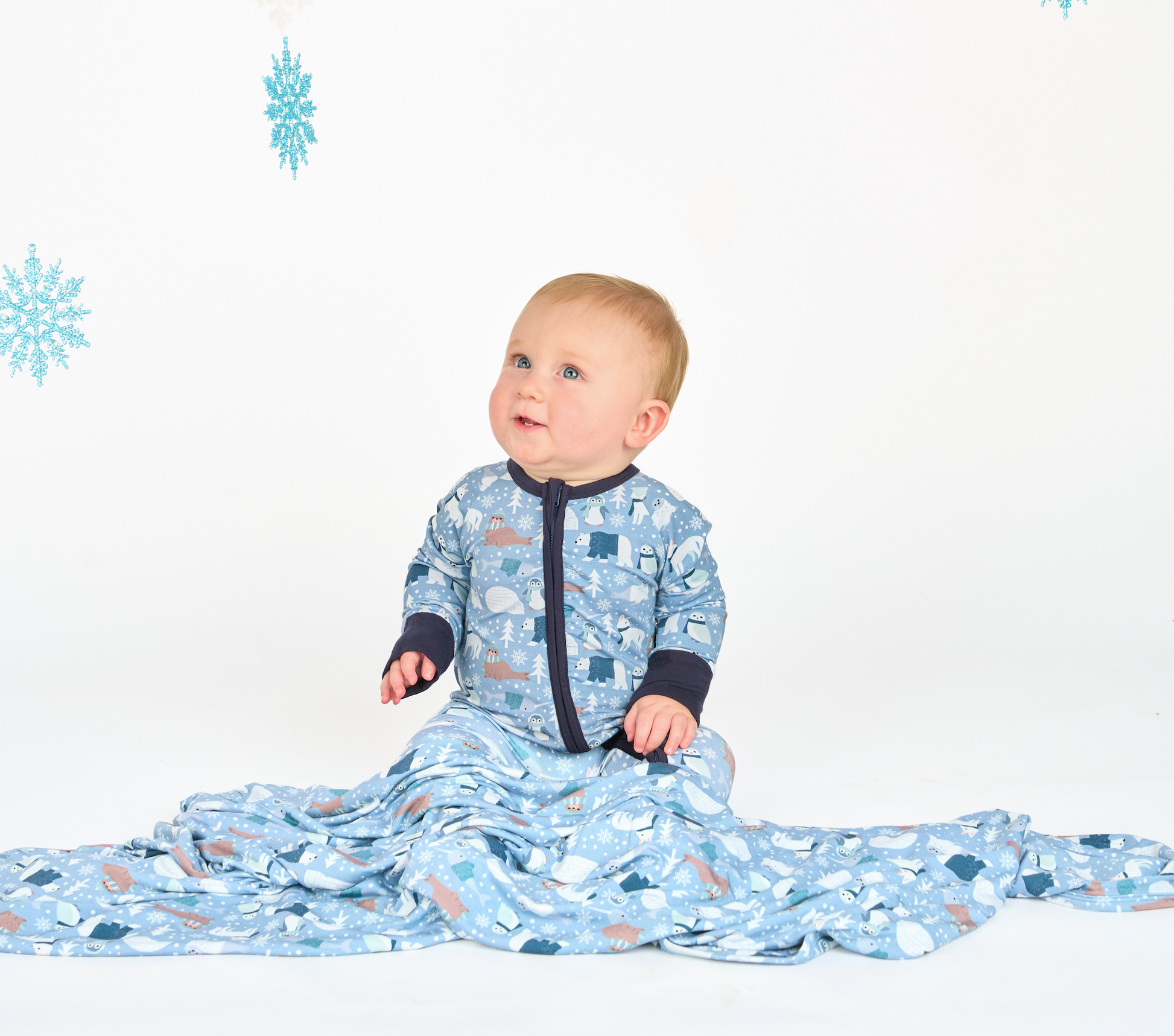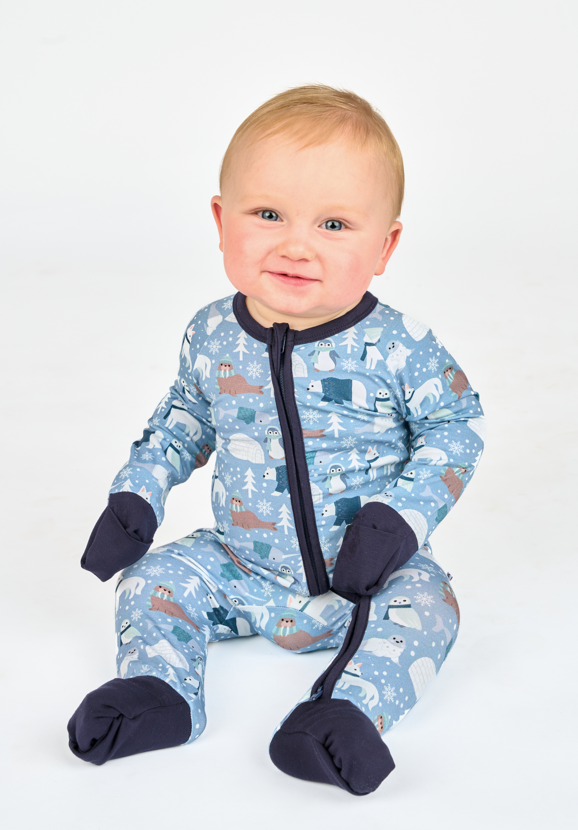 The softest bamboo baby pajamas in our Polar Pals pattern! Check out more with this print for the cutest sibling match! * SWEET DREAMS: Made from high quality bamboo, our baby pajamas are the recipe for a perfect night's sleep. Our bamboo pajamas start with our signature buttery soft bamboo/spandex blend that has the perfect amount of stretch for the most comfort. * FEATURES: Our two-way zipper design makes late night changes a breeze. Our pajamas include many comfort features, such as fold-over sleeves to keep baby from scratching, footie grips for crawlers and walkers, and printed neck label and neckline zipper protection.