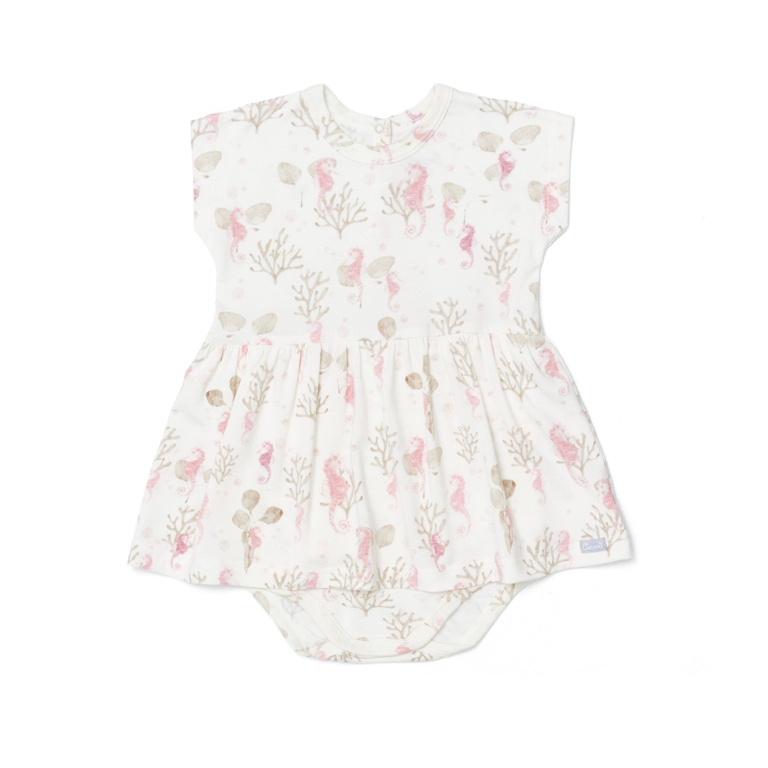 This short sleeve bodydress has a beautiful seahorse on cream background and it offers both style and comfort, with snaps at the bottom and back for easy changing. Made of modal, it's extremely soft to the touch. Perfect for your little one!