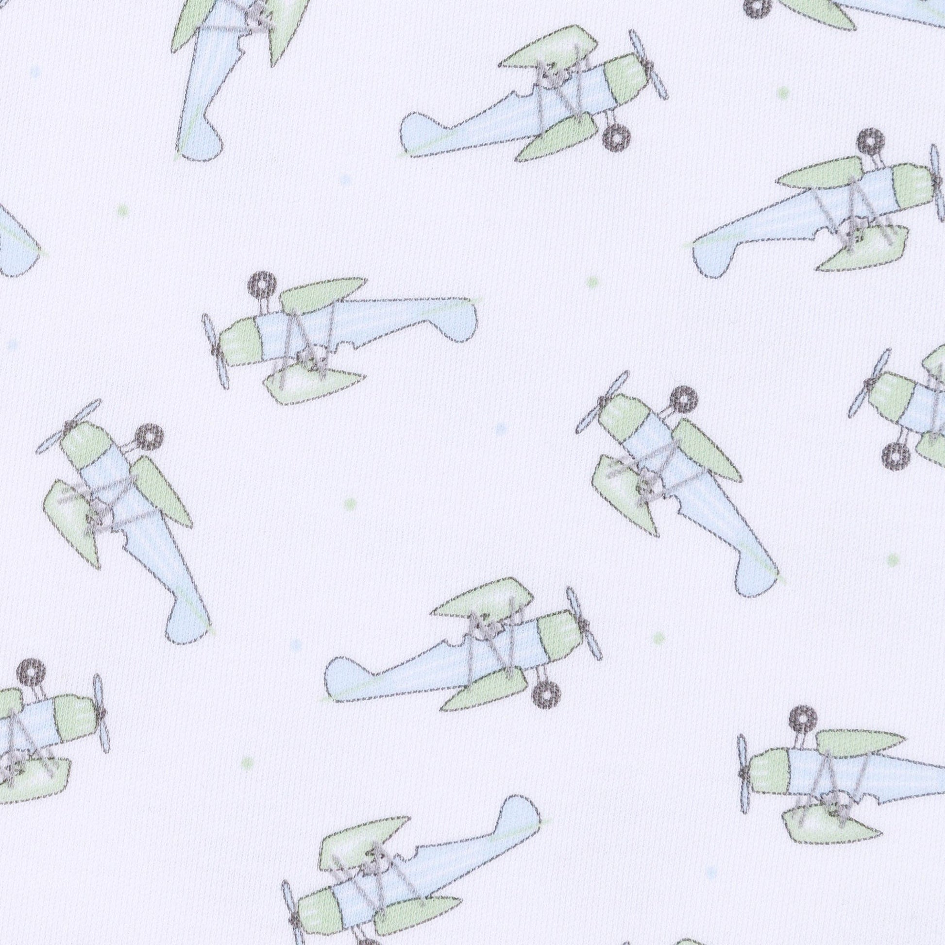 Magnolia Baby Take Flight Print Zip Footie Designed for maximum convenience, this **zip footie** makes dressing and quick changes simple and fast. Made from our luxurious Pima Cotton, it features the cheerful full print of **airplanes** and is finished with a classic picot trim. Features: * 100% Pima Cotton: This exceptionally soft and gentle fabric provides ultimate comfort on sensitive skin. * Full Print: Features a playful, all-over print of **airplanes** for a whimsical look. * Two-Way Zipper: The convenient two-way zipper makes middle-of-the-night dressing and diaper changes simple and quick. * Picot Trim: Finished with a dainty picot trim along the edges for an heirloom touch. * Footed Design: Keeps little toes warm and cozy. Benefits: * Easy Care: Made to withstand countless washes and adventures while retaining its vibrant print. * Effortless Style: A cute piece that is both practical and charming for everyday adventures.