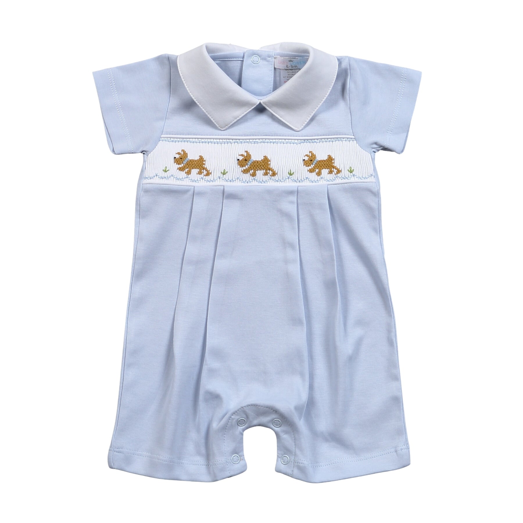 This blue dogs hand smocked pima romper has short sleeves with a baby blue body and contrasting white collar. Three hand smocked dogs across front. Snaps at back and bottom for easy changing. Made from 100% hypoallergenic pima cotton. Matches with our Pink Dogs Hand Smocked Pima Bishop Bubble for perfect brother/sister coordinating outfits.
