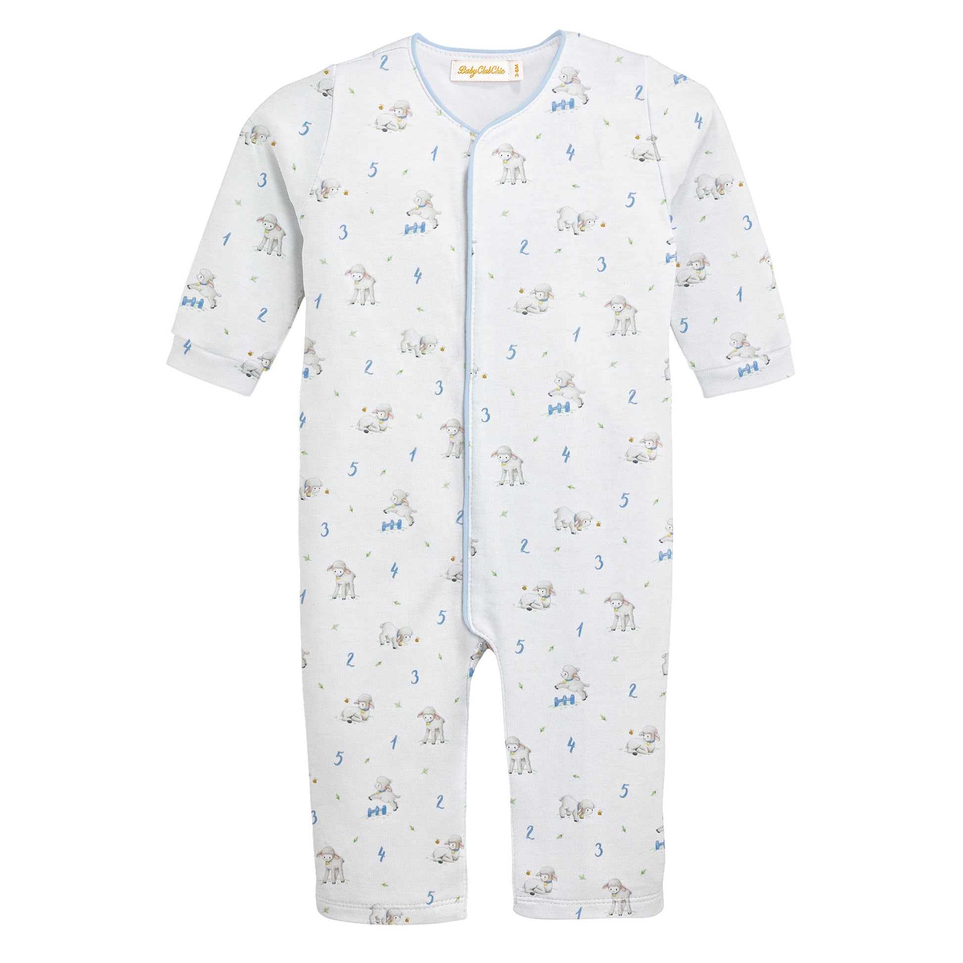 Wrap your little one in the soft, comfortable luxury of our Counting Baby Sheep Blue Pima Coverall. Featuring a charming all-over print of blue counting sheep, this long sleeve coverall is made from 100% pima cotton for the ultimate in comfort. With hidden snaps for easy changes and stylish blue piping, this coverall is perfect for your little boy.