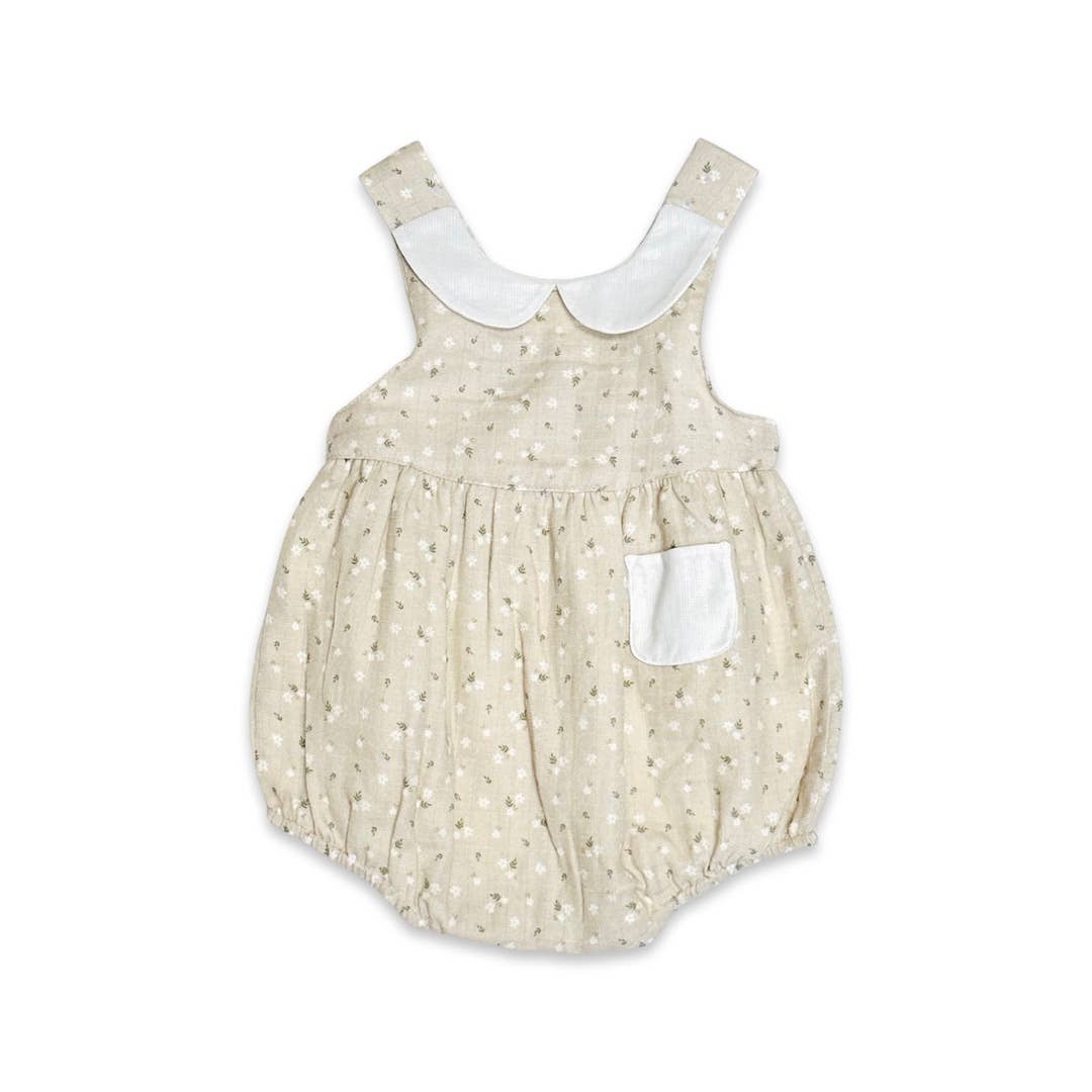 Sleeveless bubble romper for baby girl, made with ultra soft organic muslin fabric. - Peter Pan style collar. - Front pocket and adjustable shoulder straps. - Snaps around the crotch area for easy diaper changes. - 100% ORGANIC COTTON MUSLIN with organic cotton voile lining. - Soft, lightweight, breathable, cozy, and comfy; perfect for spring and summer. - Digitally printed for extra softness. - Chemical free & non-toxic formulation, eco-friendly & sustainable. - Machine wash and dry, durable and long lasting.