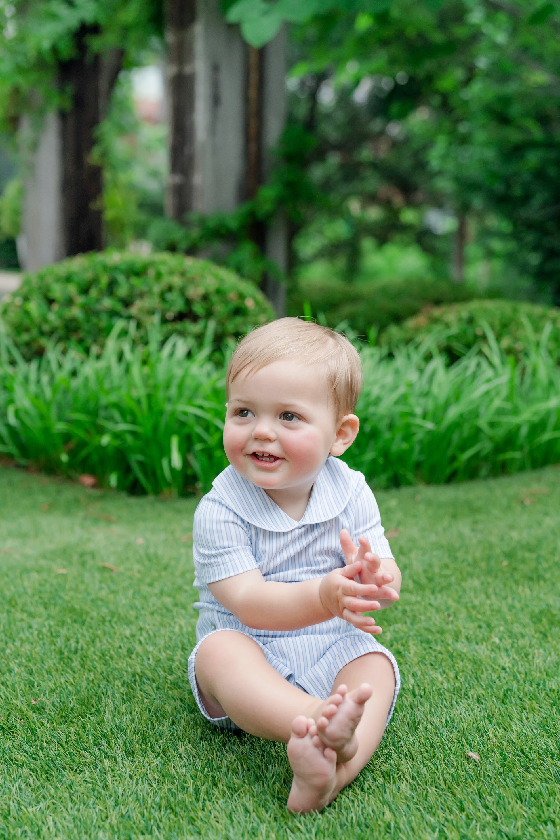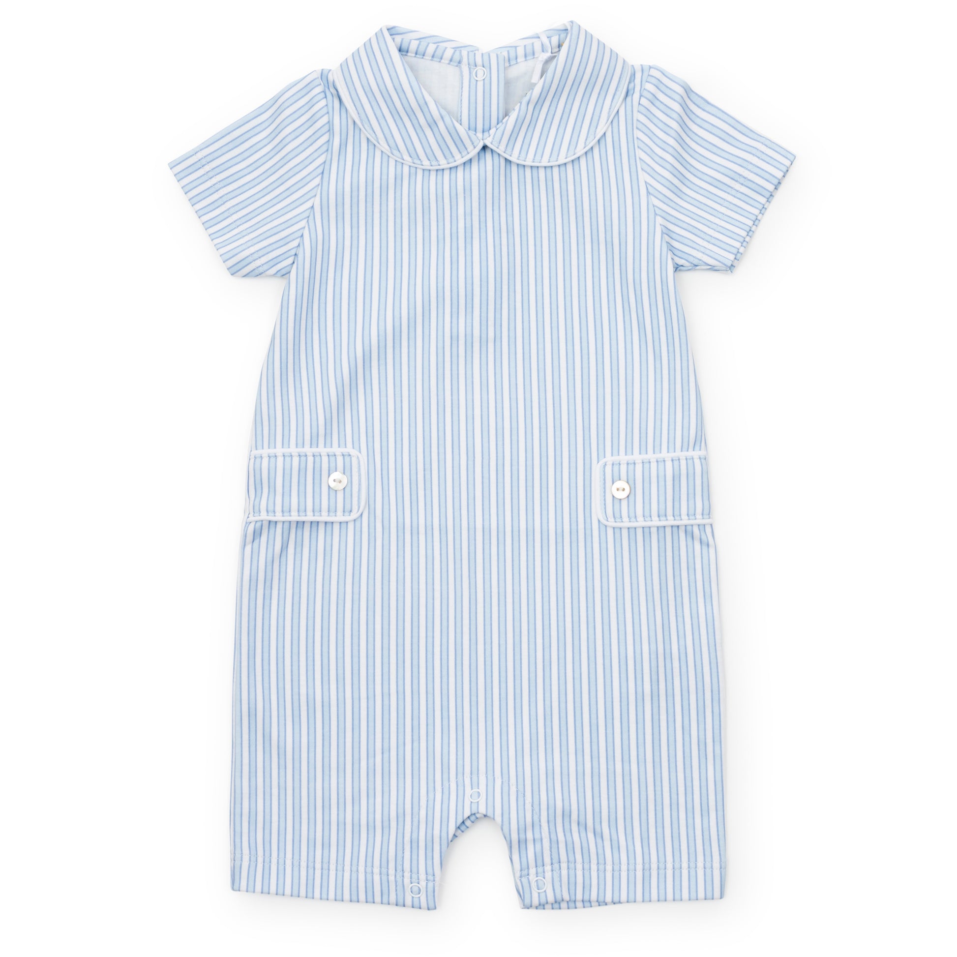Boys pima cotton shortall with contrast stitching on collar and side pockets. Snaps in stride and at back of neck.