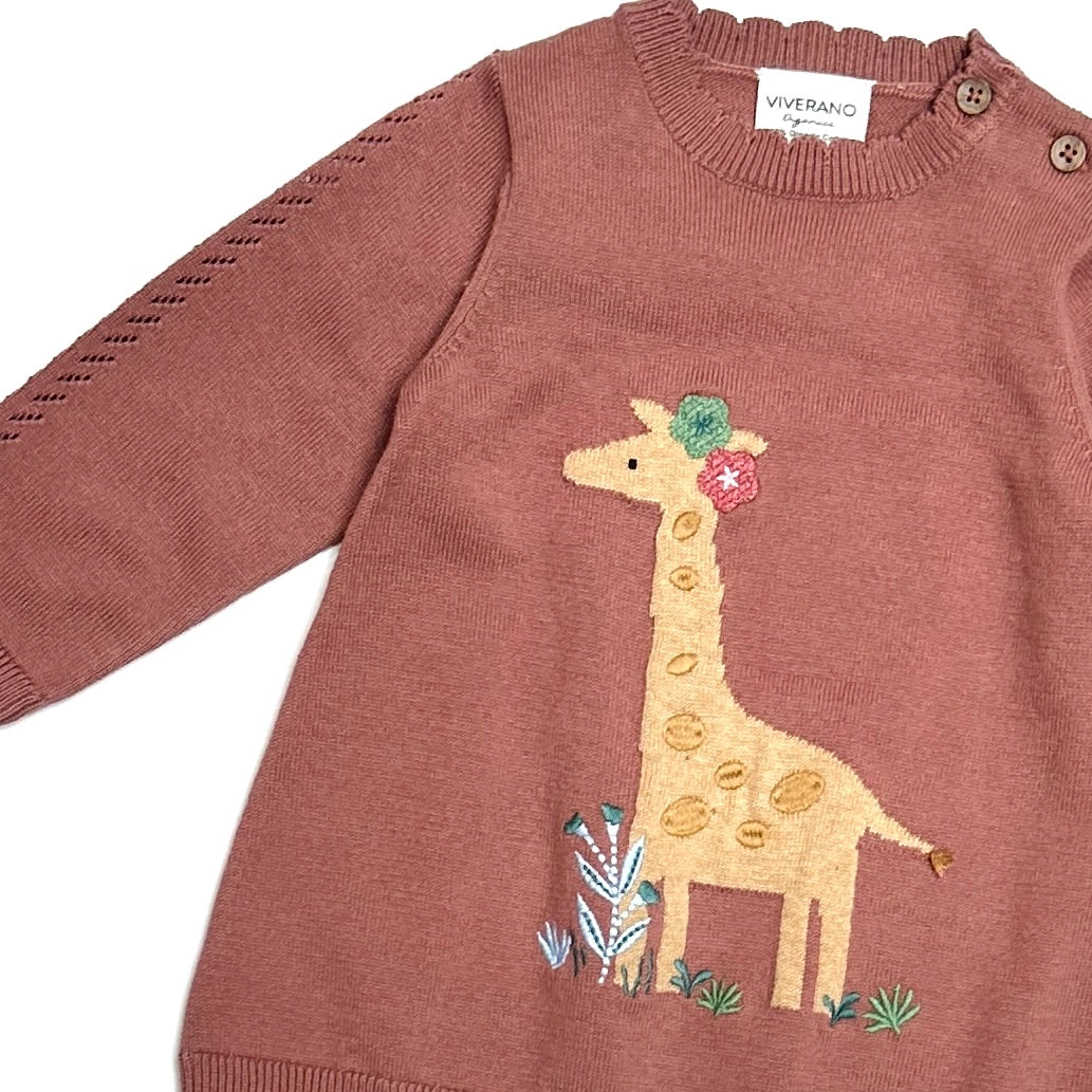 Giraffe long sleeve baby girl dress with floral embroidery and pointelle design details, all made with organic cotton.