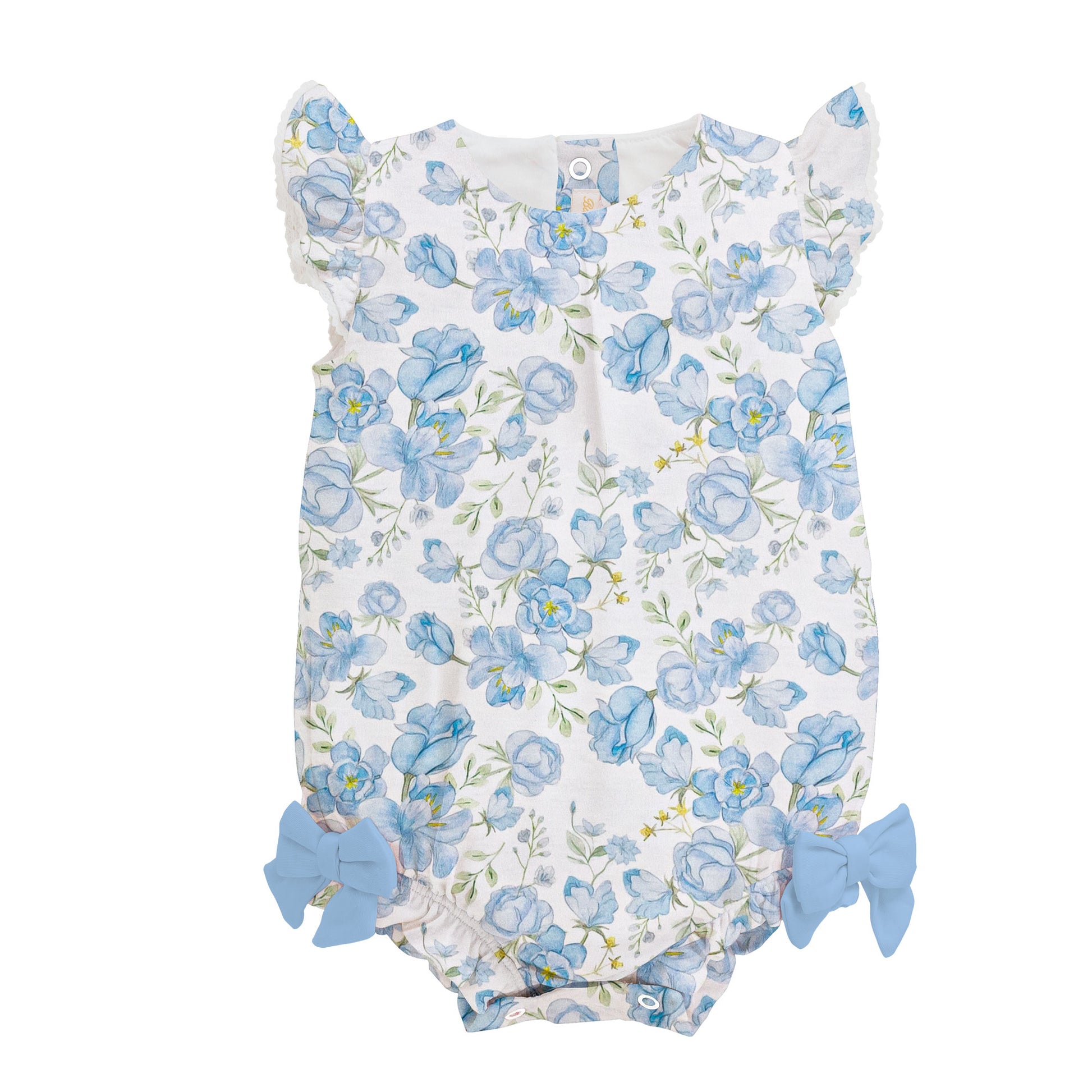 Indulge your little one in pure comfort and style with our Spring in Blue Pima Ruffle Bow Bubble. The beautiful blue flower print and ruffle sleeves add a touch of charm, while the snaps at the crotch and back make changing a breeze. Made with 100% pima cotton, this bubble is perfect for your baby girl during the spring and summer seasons.