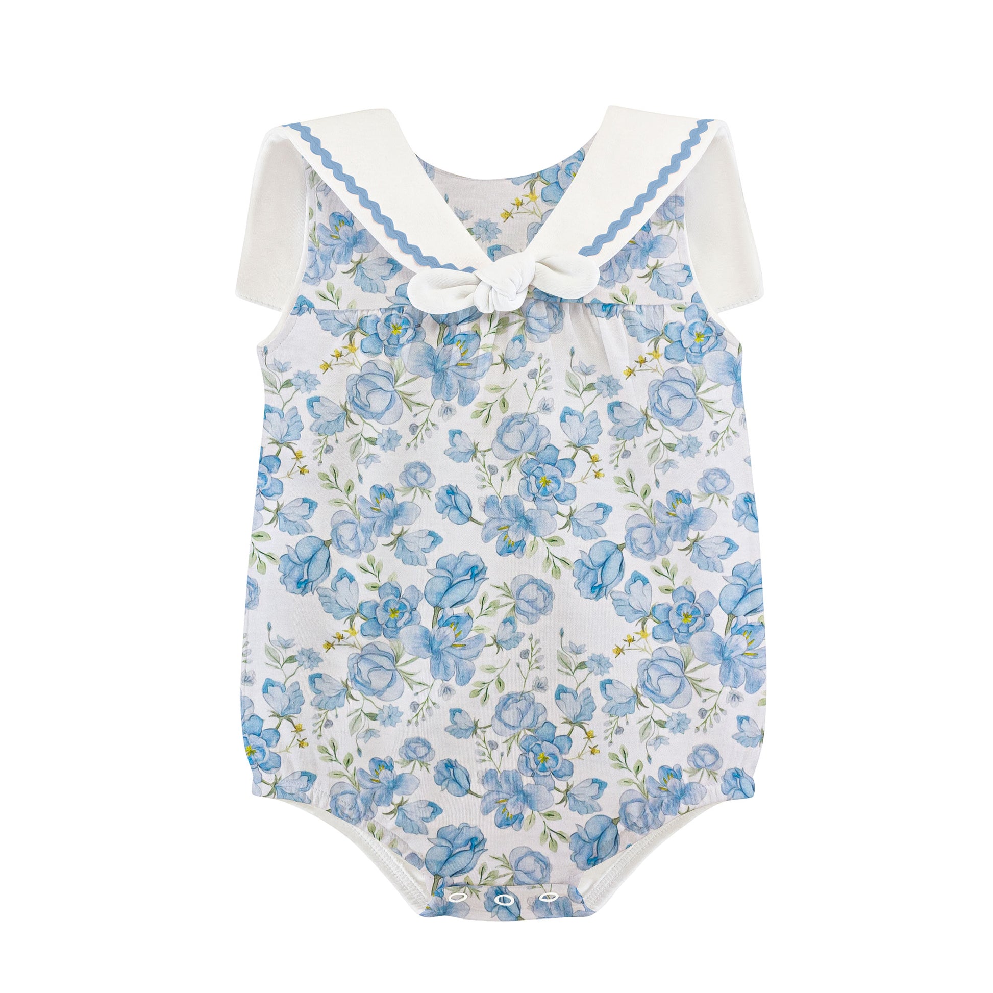 Dress your little one in our adorable Blue Pima Sailor Collar Bubble! Made from 100% pima cotton, this bubble features a beautiful blue flower print and a charming white sailor collar with blue trim. With snaps at the back and bottom, changing is a breeze. Give your baby girl the perfect outfit for spring and summer!!