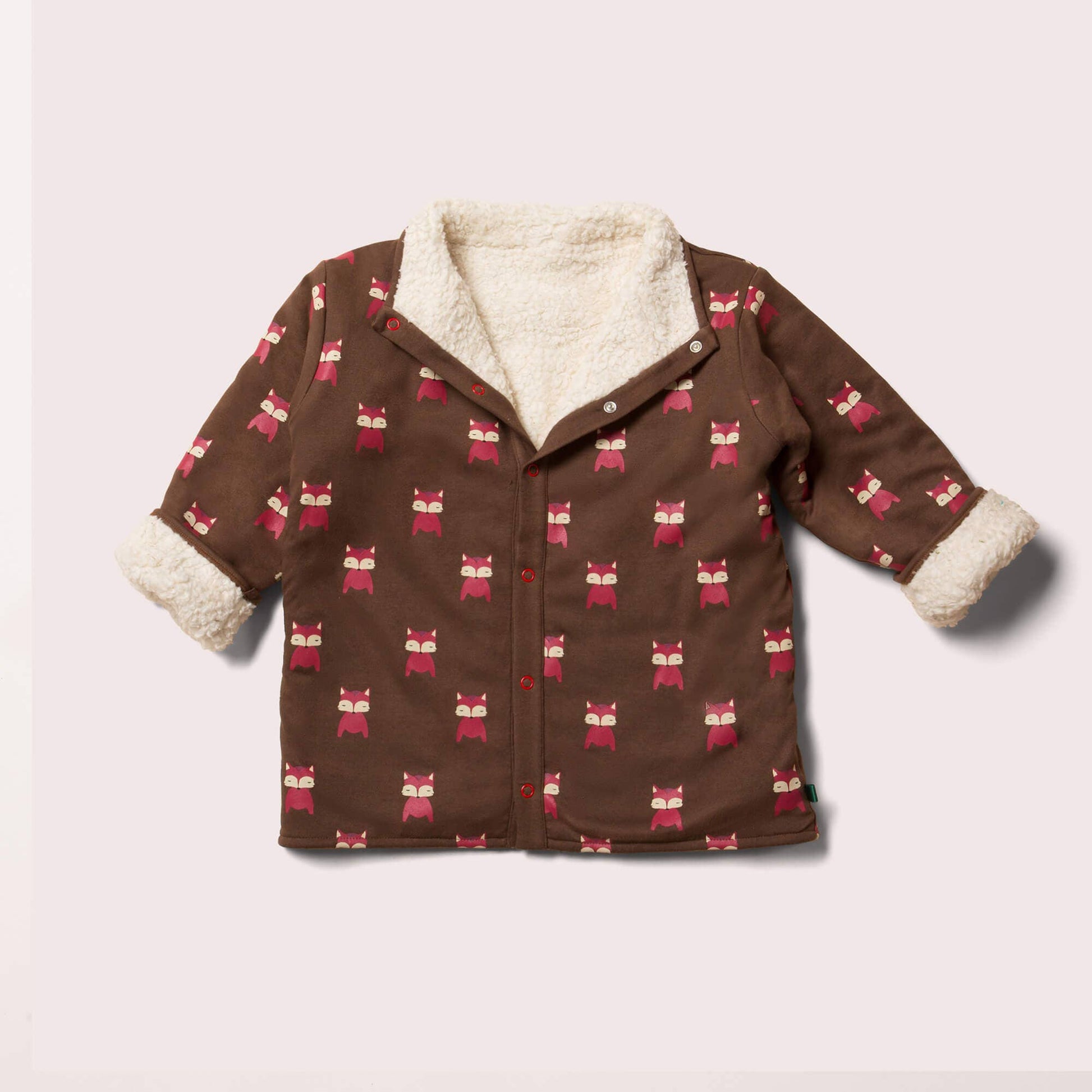 100% Organic & Fair trade Brushed Cotton This lovely and cozy jacket will keep little ones warm when they're out adventuring on cold and windy days. It's reversible, and comes with snuggly organic sherpa fleece on one side and a colorful print on the other!
