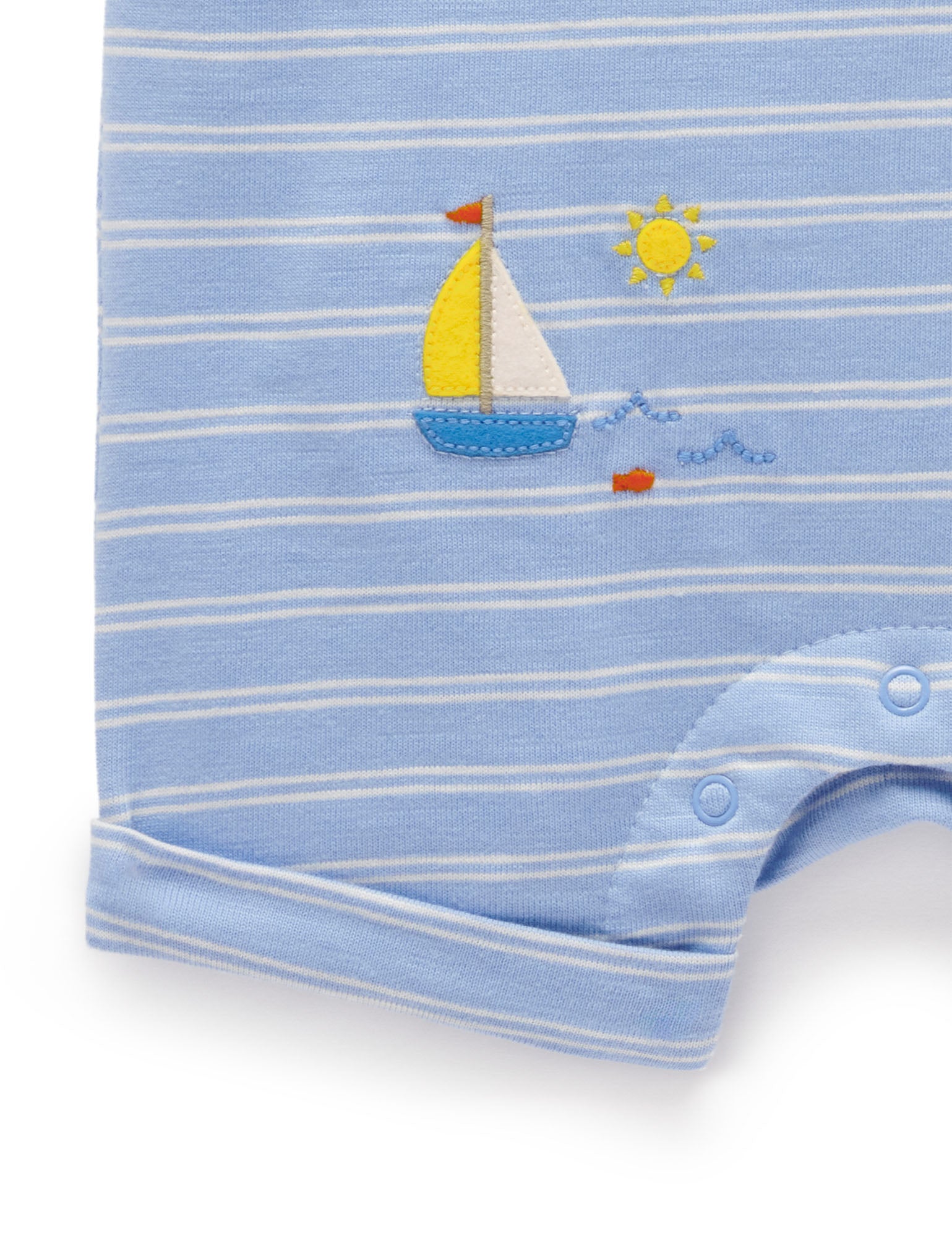 Soft, easy and practical, our Sail Away Short Romper is a lightweight and functional summer piece. Featuring snaps at the leg and shoulder for easy dressing. Featuring a classic all over stripe with a seaside applique. Made from our 100% Organic Cotton for the softest touch.