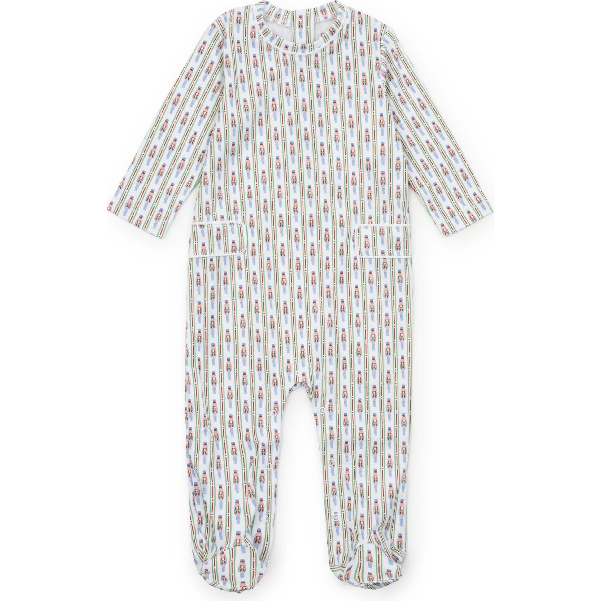 Long sleeved pima cotton footed romper with piping detail around neck, and side plackets. Snaps in stride and back of neck.