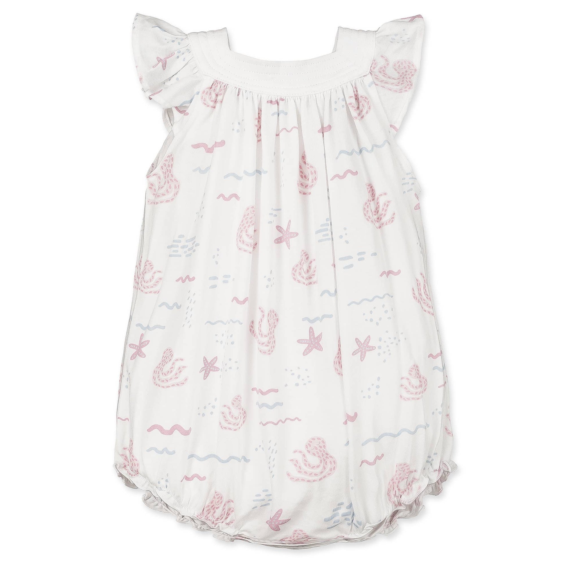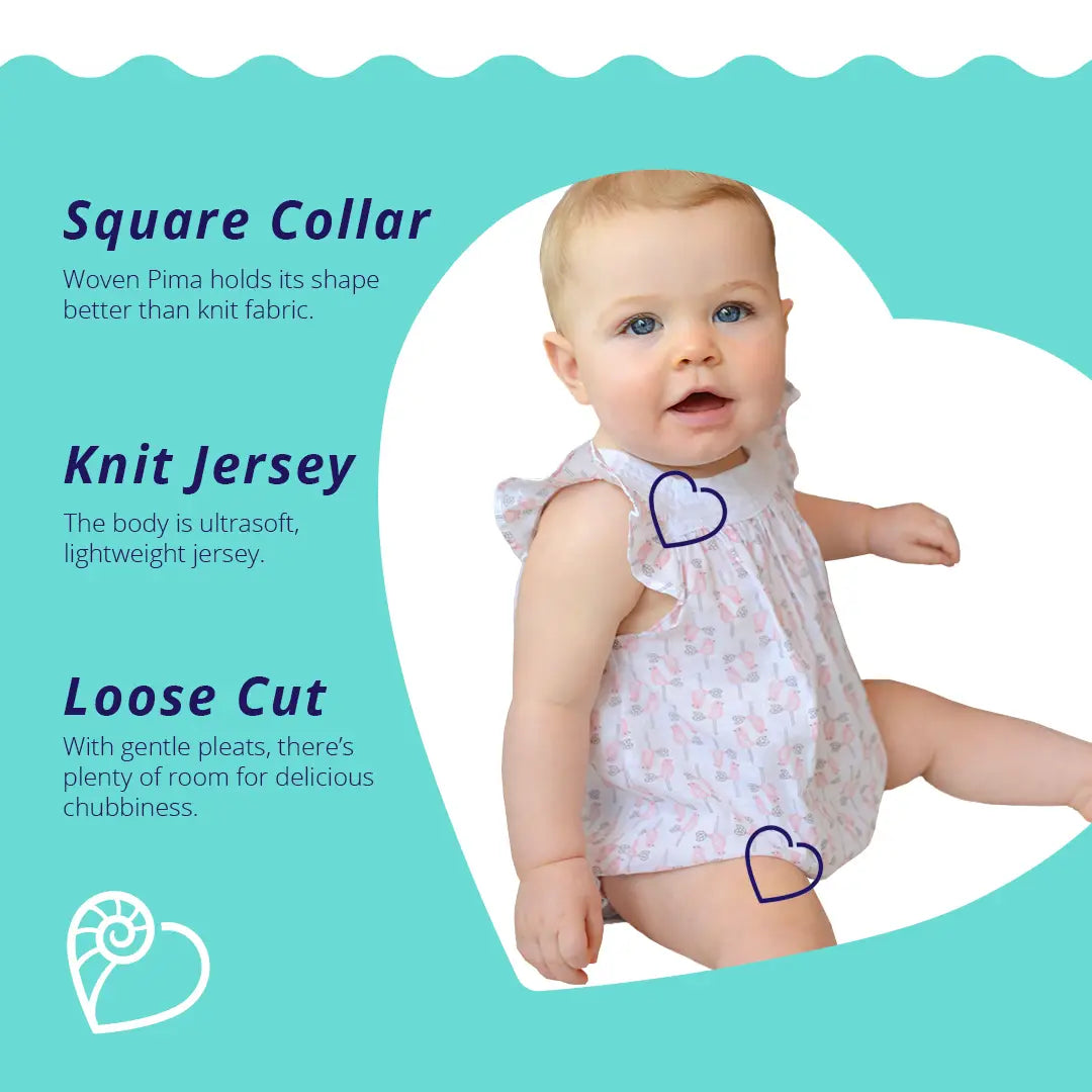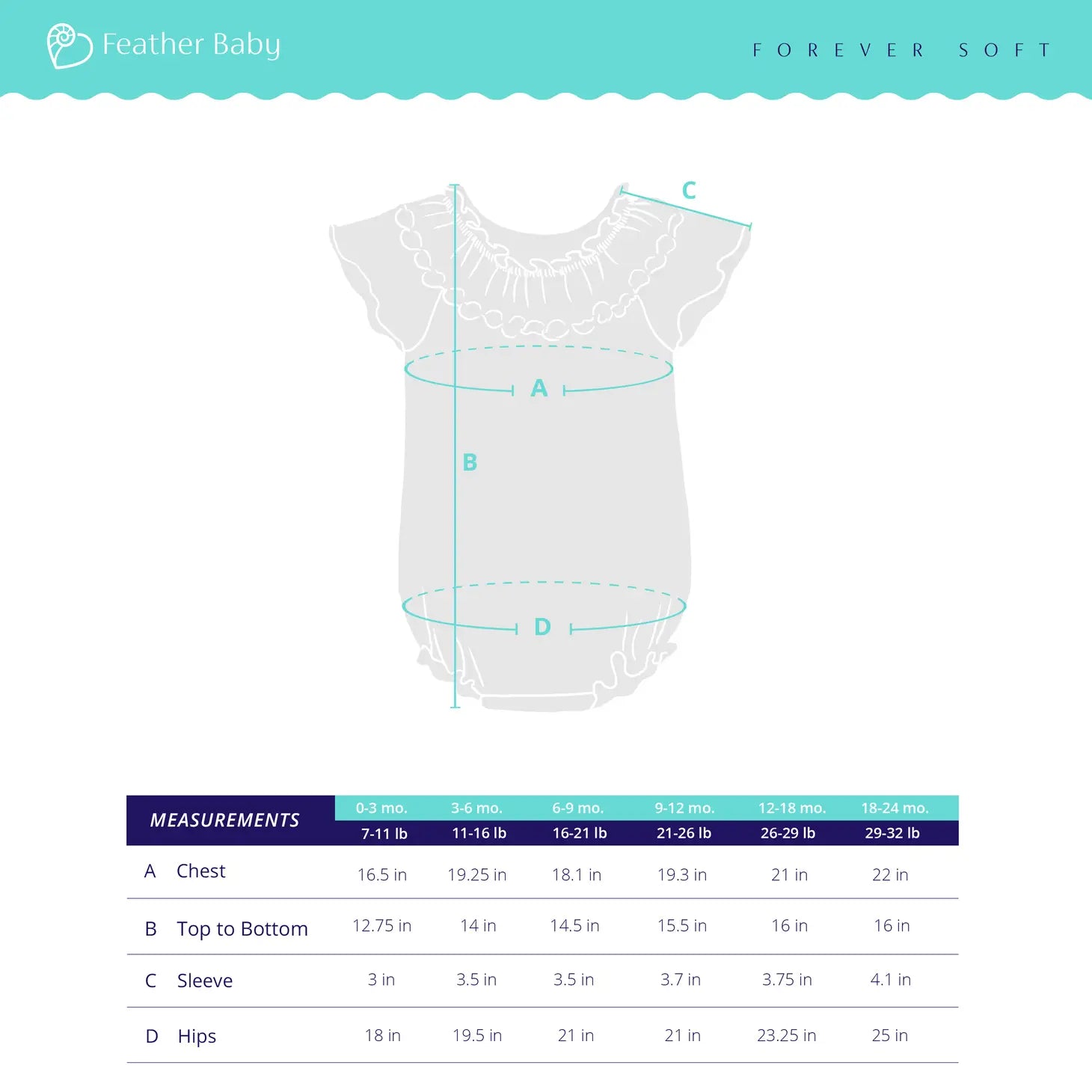 On this silhouette, to keep the fashionable collar from drooping, we use woven batiste that holds its shape better. Below that, the roomy body is pleated in our luxuriously soft jersey Pima. Button- loops at the back of the collar and snaps along the inseam. LIGHTWEIGHT JERSEY drapes beautifully, is never clingy, and is knit exclusively for Feather Baby. 100% Pima Cotton—with the longest cotton staple in the world, Pima cotton is luxuriously soft, washes great, never pills.