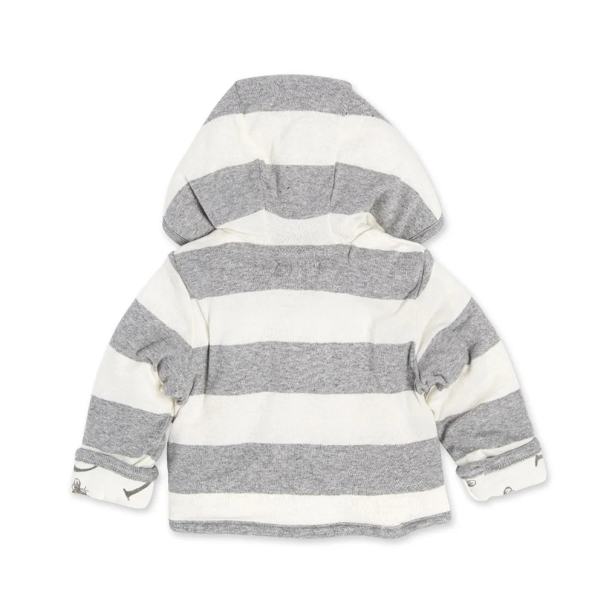 Your little bee gets 2 looks in 1 with our organic cotton snap front hooded reversible jacket! Choose to show the watercolor alphabet letters and buzzing bees print or rugby stripes. Decorated with enamel bee snaps and contrast binding. Styling tip - roll the cuffs show a peek of the other print!