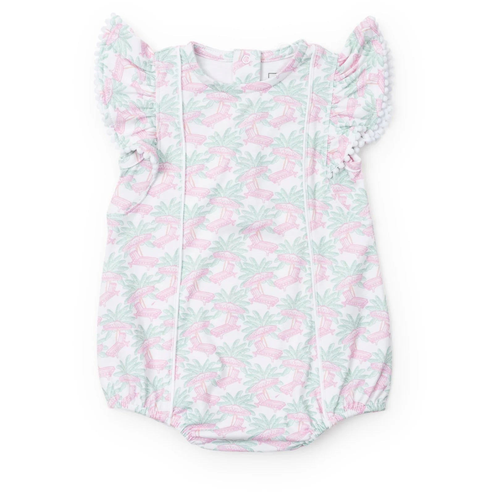 Girls' pima oversized flutter sleeve bubble with pom pom trim and contrasting piping. Button closure in the back. Made from 100% Peruvian Cotton.