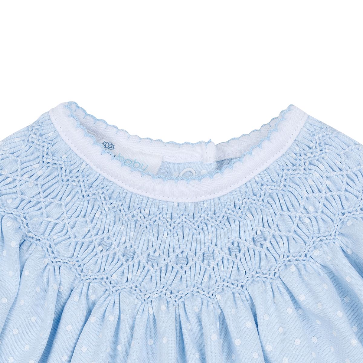 Introduce your little one to timeless elegance with this exquisite hand-smocked bishop gown from Magnolia Baby. Crafted from premium pima cotton, this long-sleeve gown features delicate blue and white smocking that adds sophisticated charm to any occasion. The soft light blue body is adorned with subtle white dots, while delicate crochet trim frames the banded arms and neckline for a touch of vintage-inspired grace. Practical back snaps ensure easy dressing, and the elasticized bottom provides a comfortable, secure fit. Perfect for special moments or everyday wear, this heirloom-quality piece combines comfort with refined style.